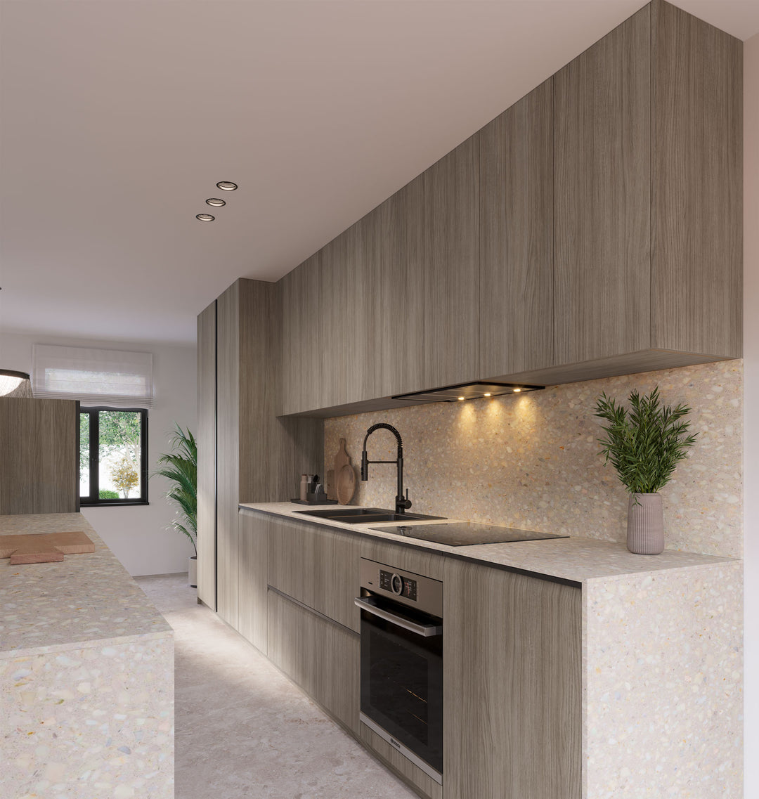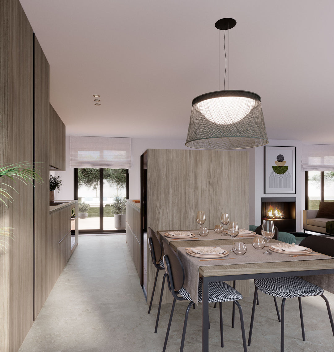 Ideea este de a crea o tranzitie fluida intre bucatarie si alte zone ale casei, cum ar fi dining-ul, living-ul sau chiar spatiul de lucru. Acest lucru se realizeaza prin integrarea unor elemente de design coerente, precum culorile, texturile si finisajele, care sunt repetate subtil, dar eficient, in intreaga locuinta.