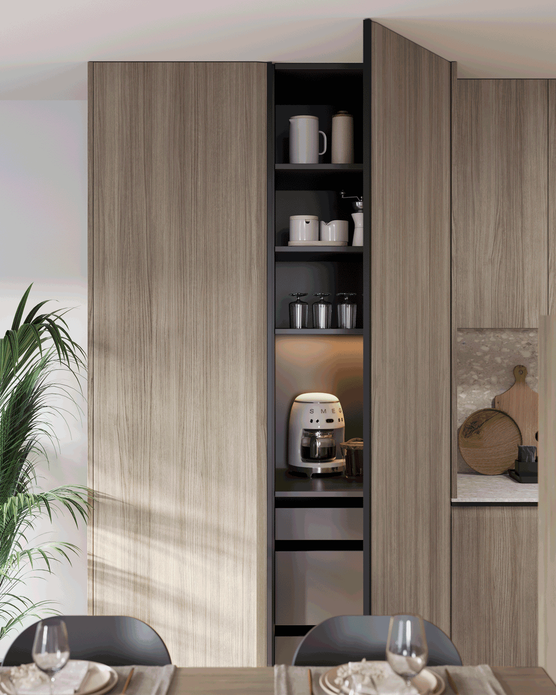 La fel ca modelul de usa TUBALU, vitrina MAI apare atat in bucatarie, cat si in zonele de living. Un concept de mobilier de bucatarie care se extinde in alte spatii ale casei si care isi propune sa creeze o experienta de design integrata si holistica, ce combina stilul, functionalitatea si confortul in intreaga locuinta.