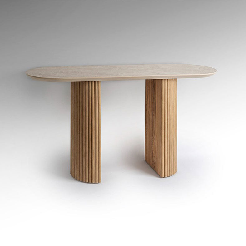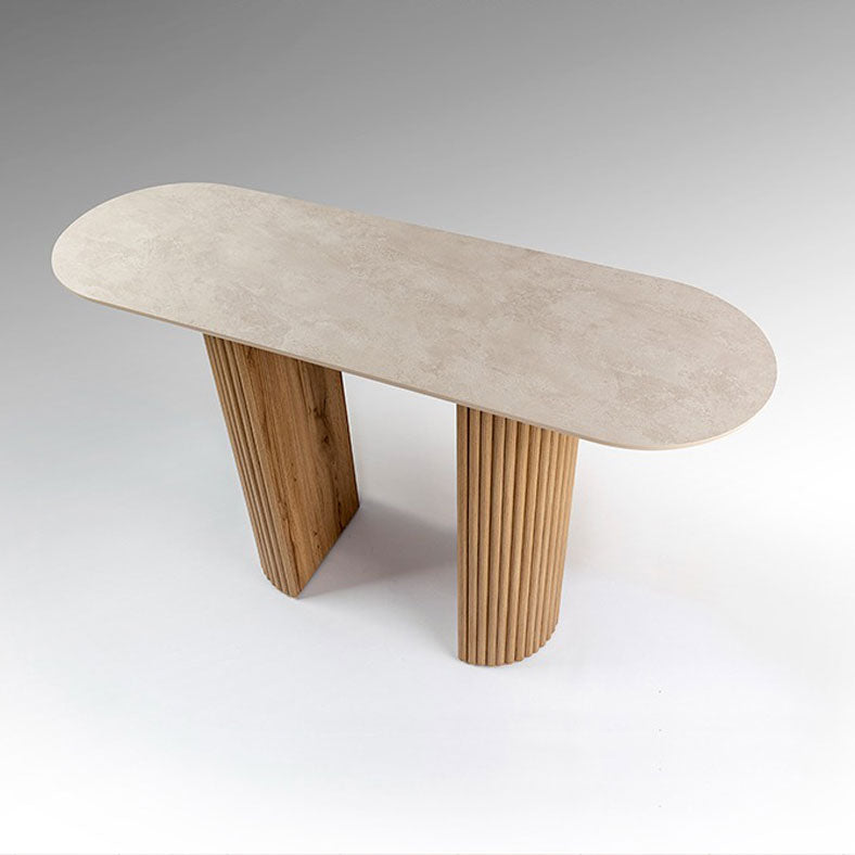 Consolă cu structură din MDF și picioare cu suprafață canelată, finisaj din lemn. Blat din MDF cu suprafață din melamină de înaltă rezistență, finisaj mat de piatră, cu muchii asortate.