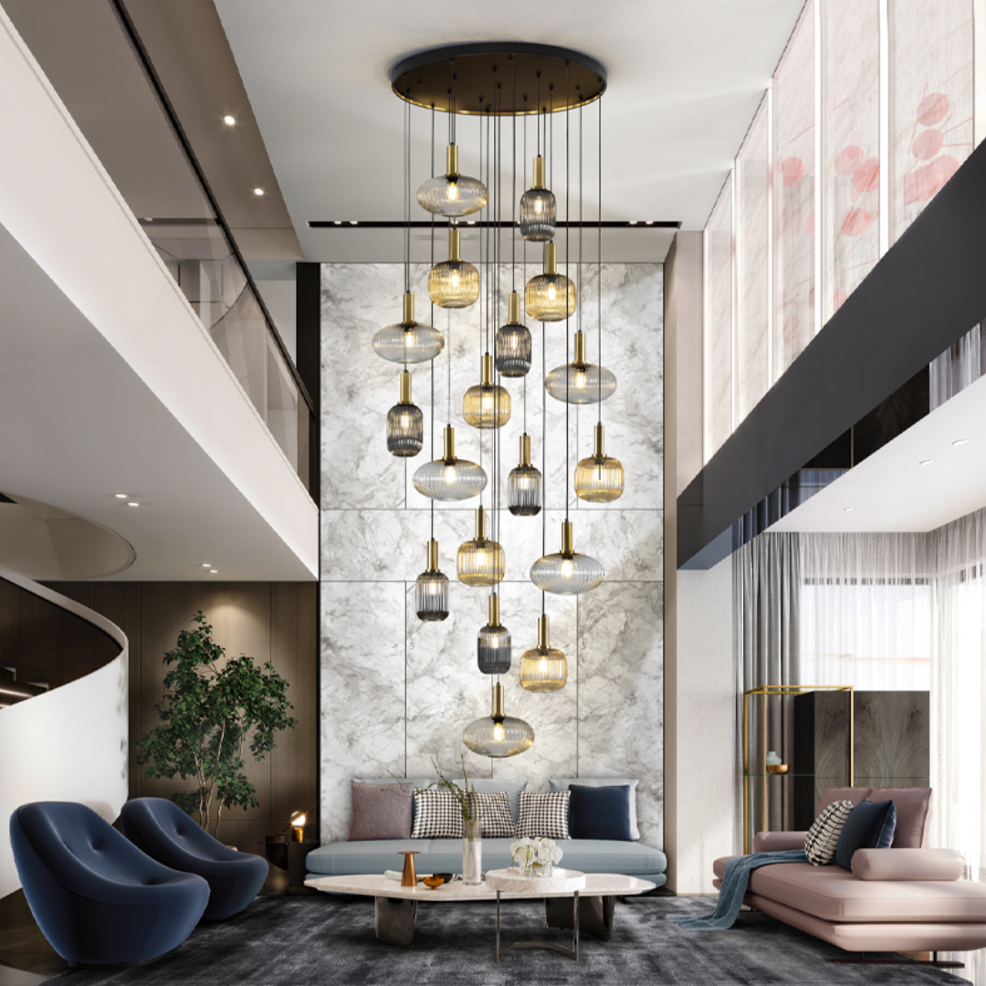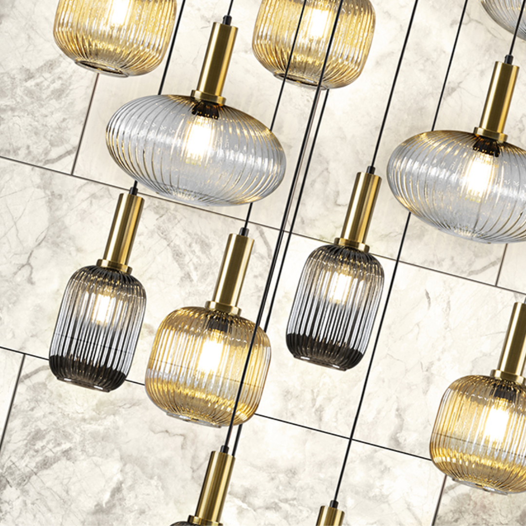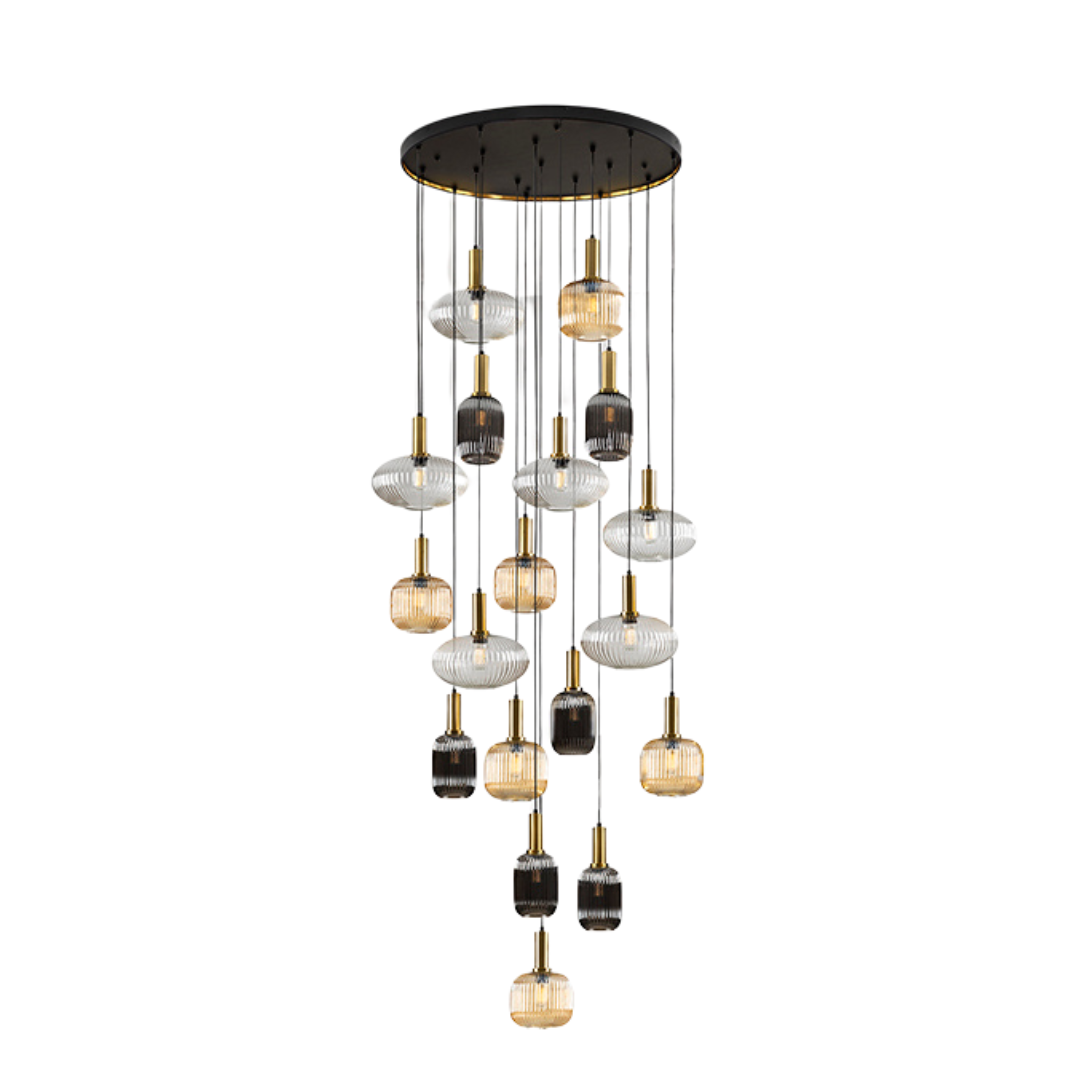 Lustra cu 18 becuri, realizata din metal finisat in negru mat, cu detalii elegante din alama satinata. Abajururile sunt confectionate din sticla modelata, disponibile in trei variante de finisaj: transparent, chihlimbar si gri fumuriu sclipitor, pentru un efect vizual sofisticat. Lungimea lampii este ajustabila, oferind flexibilitate in adaptarea la diferite inaltimi ale tavanului.