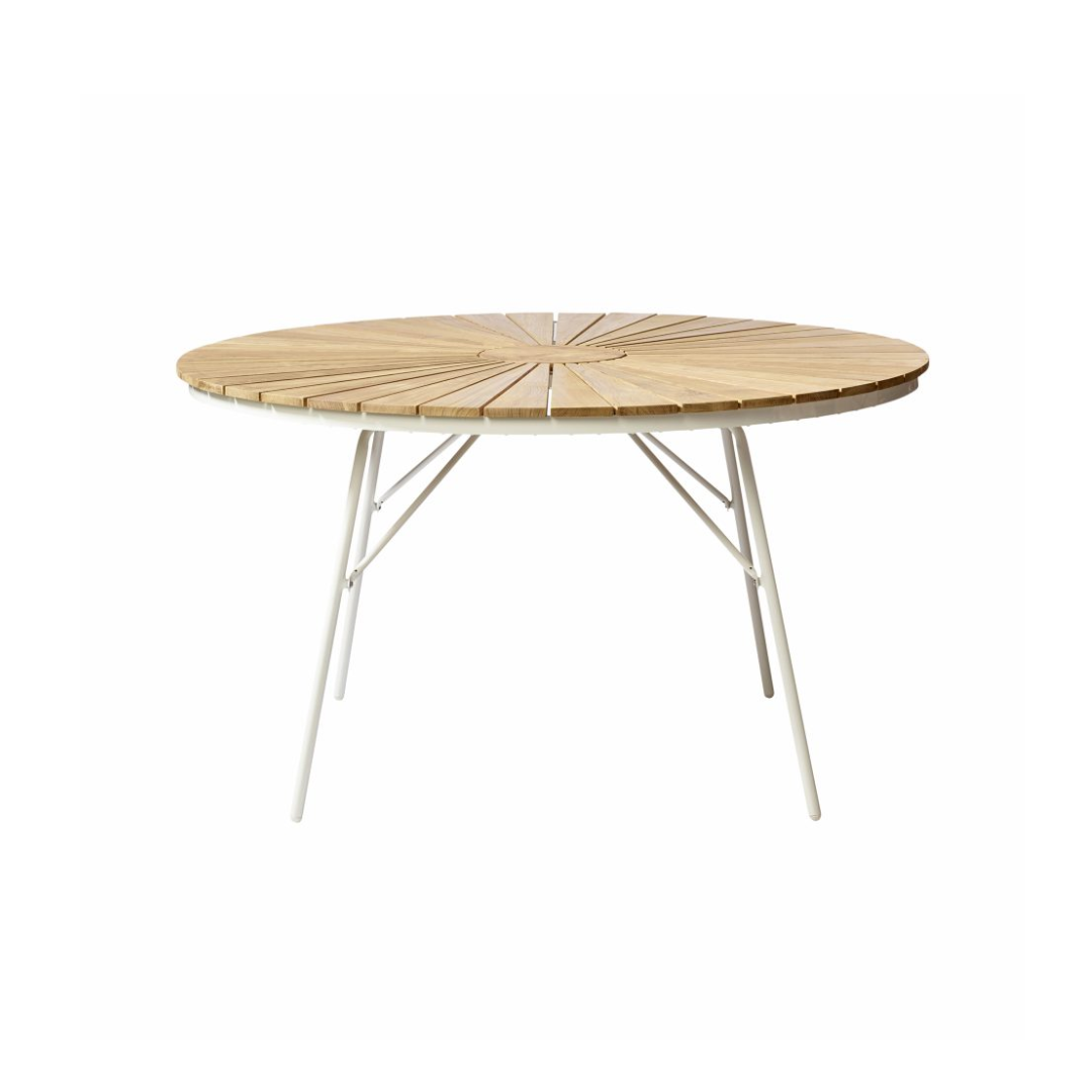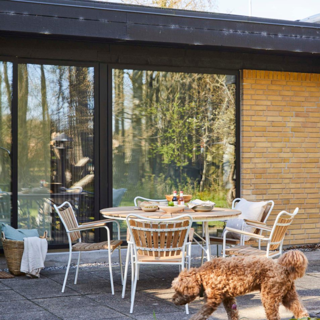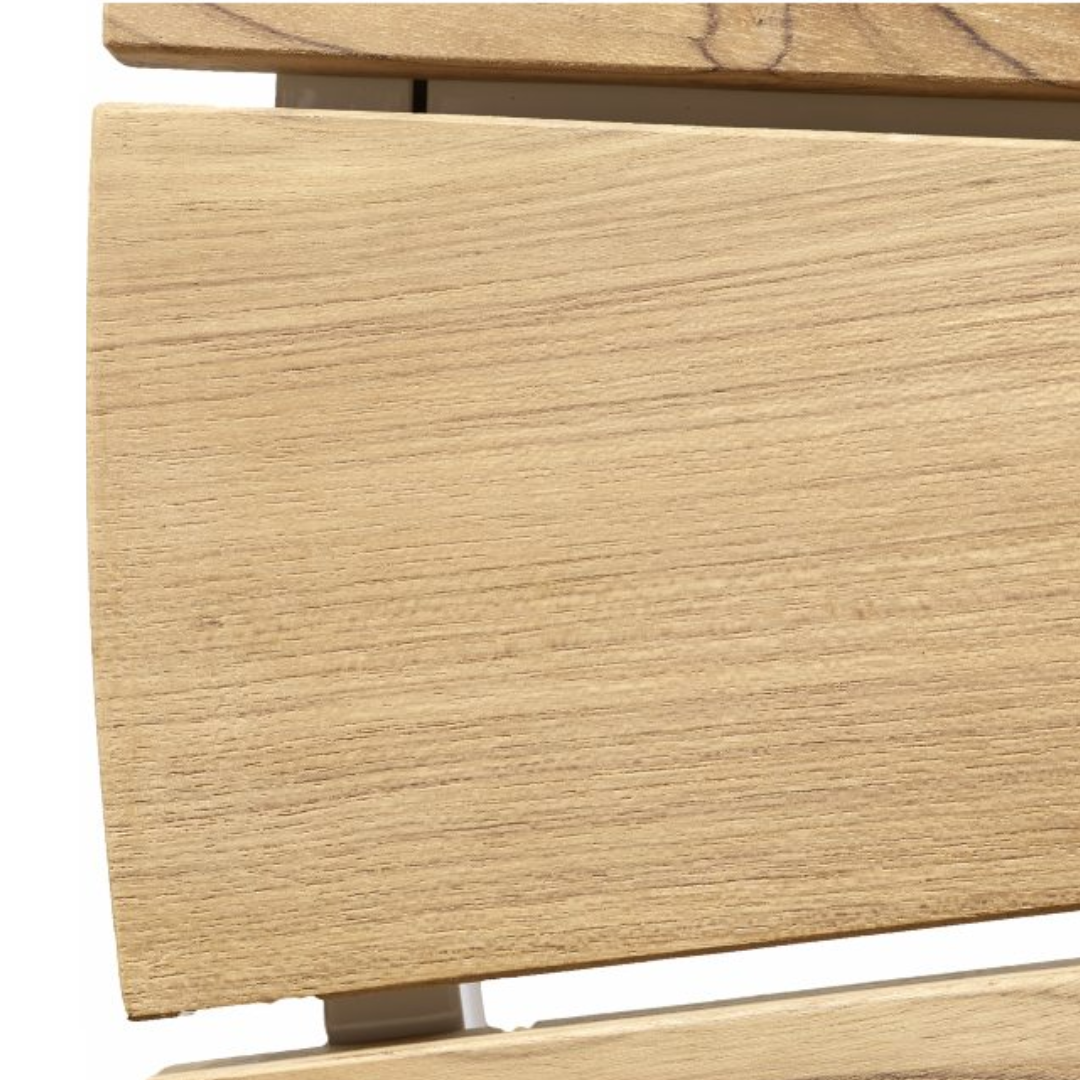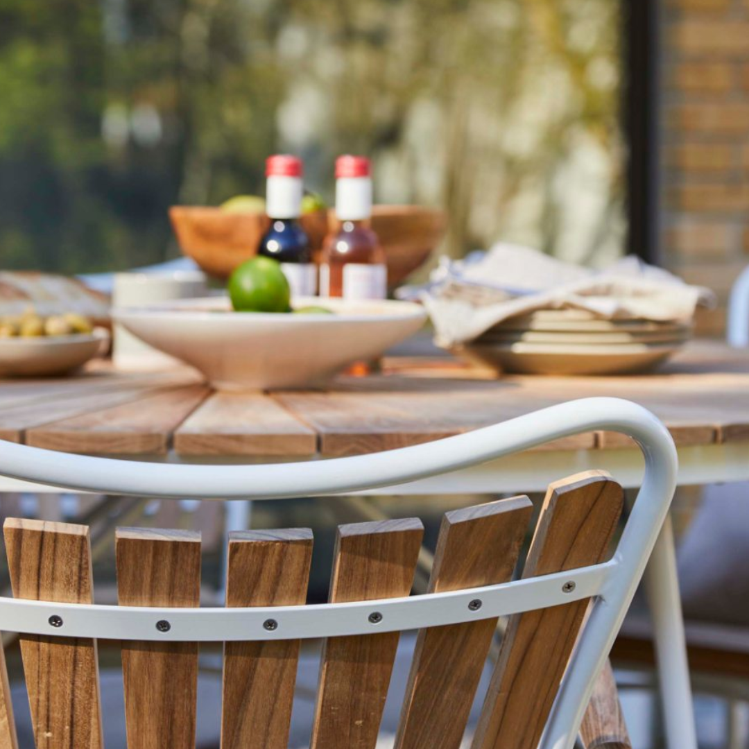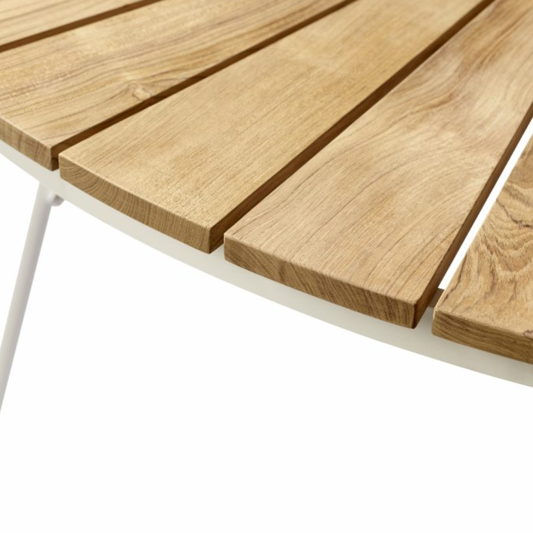 Masa de gradina Ellen imbina armonios eleganta cu functionalitatea. Este prevazuta cu lamele din lemn de tec, care ofera un aspect natural si rafinat, iar cadrul din aluminiu, acoperit cu un strat de pulbere alba, adauga un plus de modernitate.