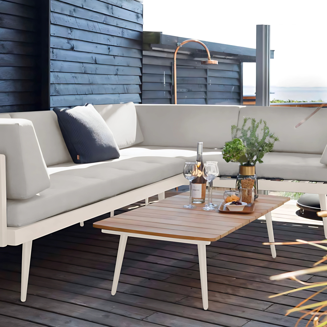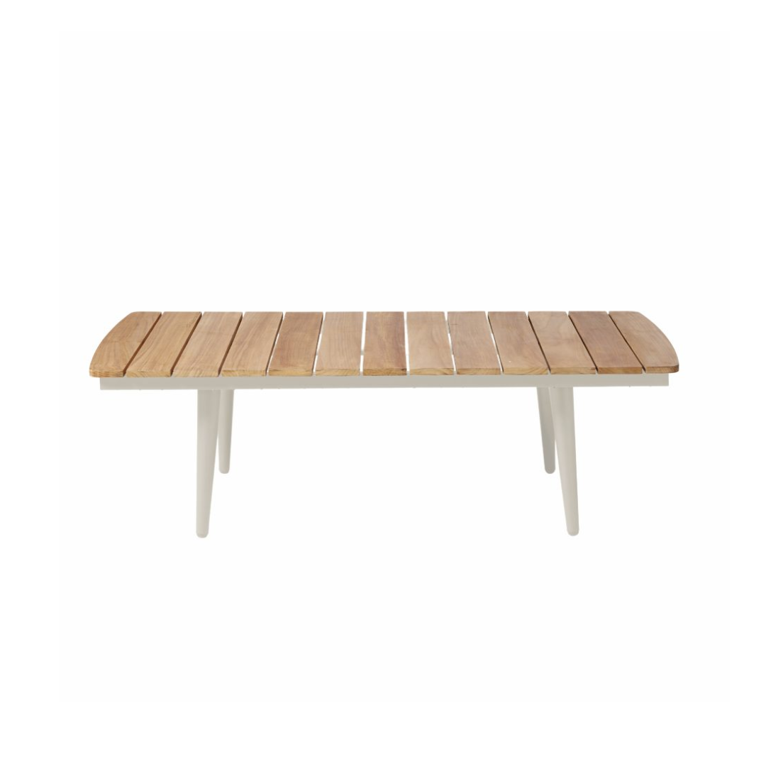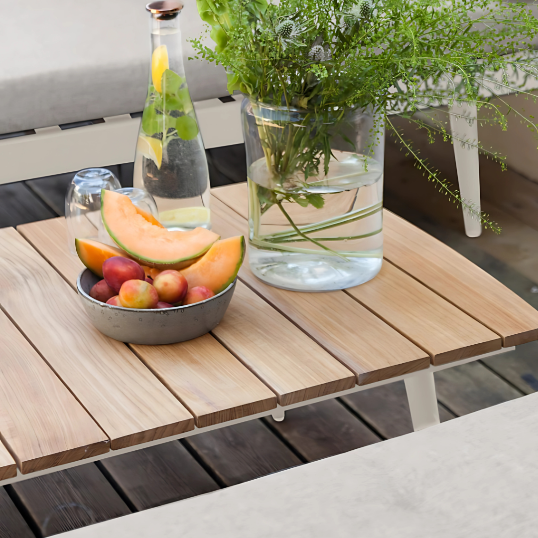 Blatul este realizat din lemn de tec de inalta calitate, iar cadrul este fabricat din aluminiu rezistent, finisat in aceeasi nuanta eleganta de Sandy Grey. Aceasta combinatie nu doar ca ofera un aspect rafinat, ci asigura si stabilitate si durabilitate in timp, chiar si in conditii de utilizare in aer liber.