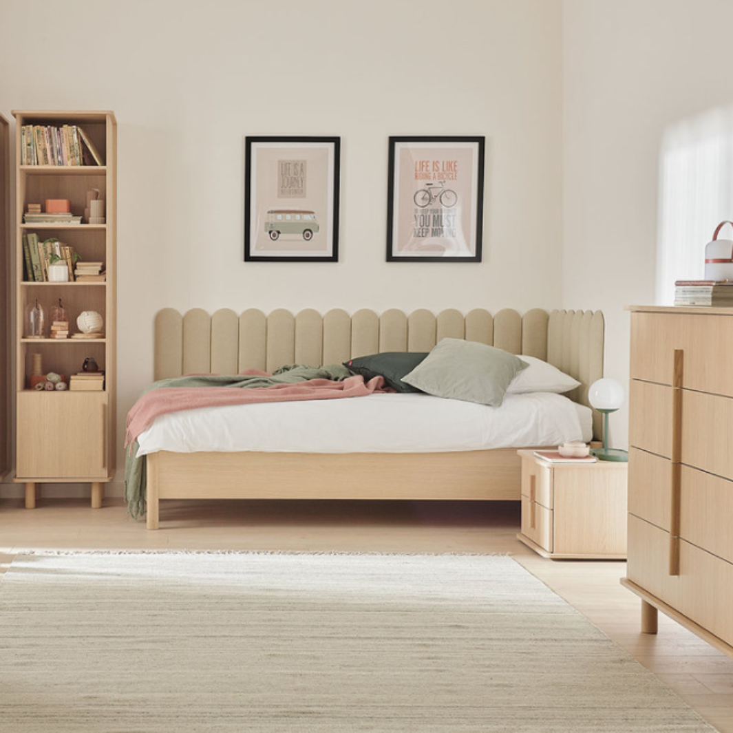 Patul fara tablie Omm ofera foarte multe optiuni pentru finisarea eficienta a peretilor, de la tapet decorativ la panouri tapitate, care pot fi folosite pe post de tablie.